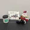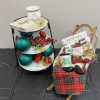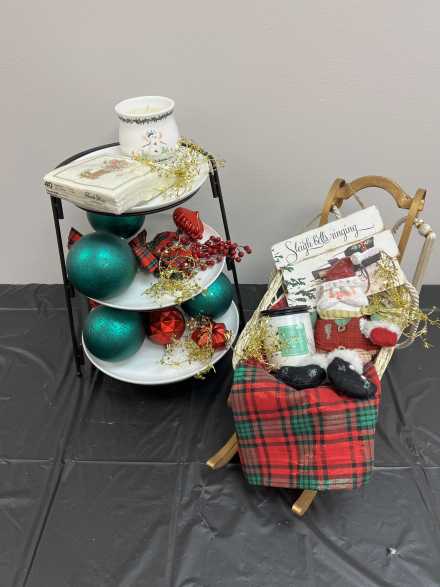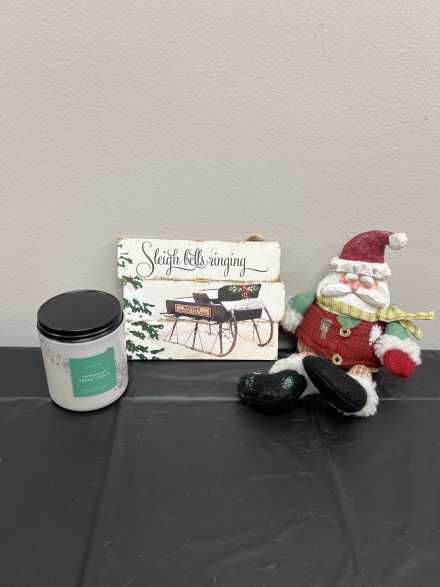 Santa arrives by a wooden and wicker sleigh along with "Sleigh Bells Ringing" wall hanging, White Barn Snowman and Peppermint Sugar Cookie candles, holiday napkins, emerald green and red ornaments, and B. Smith three-tiered serving tray.
