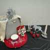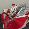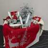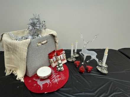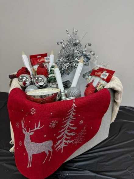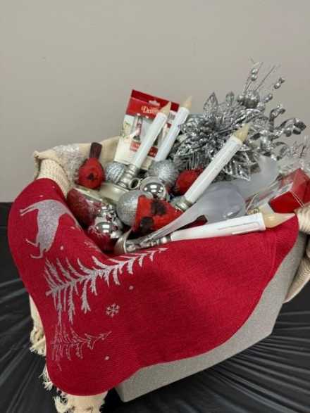 Lend sparkle and shine to your home with a 12-inch tall glass deer table topper, silver tree topper and ornaments, silver bowl candle, four battery-operated taper candles, two packs of mini battery-operated candles, pewter "Peace on Earth, Goodwill to Men" dish, silver/cream placemat, three silver/red placemats, cream throw, three mini ceramic cardinals, and Christmas tree salt shaker, all in large tote.