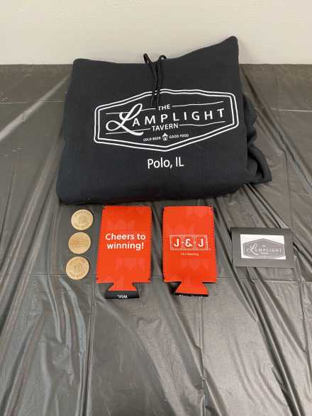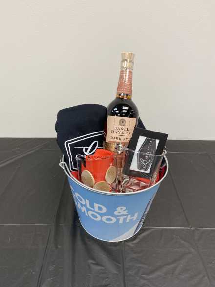 Start the evening by toasting James Beam Distilling Basil Hayden Dark Rye Whiskey with your favorite person! Share some memories while sipping from two Old Fashioned glasses, then head to The Lamplight Tavern to meet up with friends. Includes $25 Lamplight gift card, size S black hoodie, size XL red t-shirt, two koozies, and three drink chips, all in a Busch Light metal bucket.