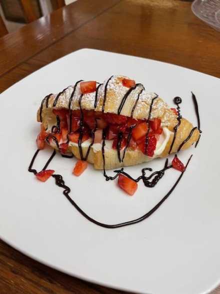 These buttery, flaky croissants are filled with a homemade vanilla-flavored cream cheese icing, filled with petite diced fresh strawberries, sprinkled with powdered sugar, and drizzled with a Ghirardelli chocolate sauce. Ooh la la!