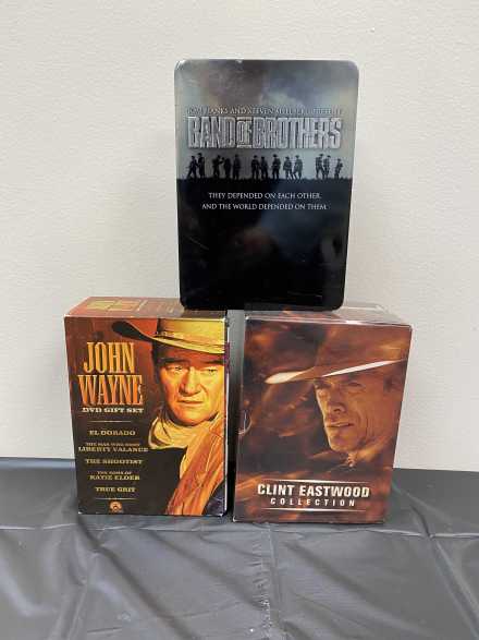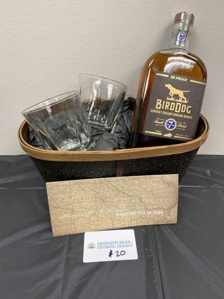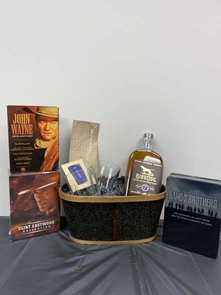 Set the stage for an evening of watching the classics, featuring two drink glasses, Bird Dog Kentucky Bourbon Straight Whiskey, and DVD collections of John Wayne, Clint Eastwood and Band of Brothers movies. Also includes $20 gift card from Mississippi River Distilling Co. and black basket.
