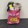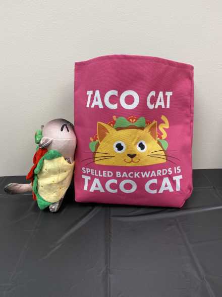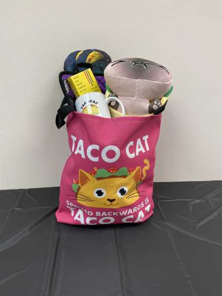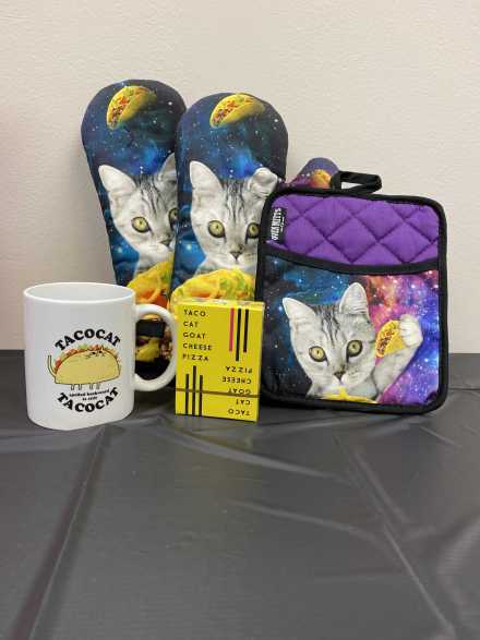 Taco cat spelled backwards is taco cat, imagine that! "Taco, Cat, Goat, Cheese, Pizza" is an addictive, family-friendly card game. Includes the card game, $25 Kelly's gift card, two Taco Cat oven mitts (you'll need them to protect your hands!) and one potholder, Taco Cat coffee cup, and Taco Cat plushy kitty wrapped in a taco, all in a fun pink Taco Cat tote bag.