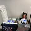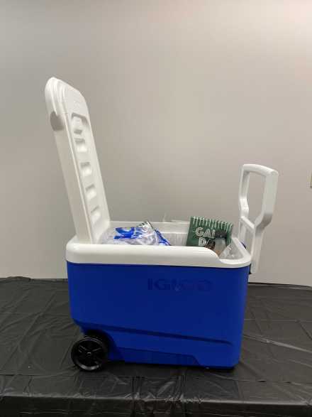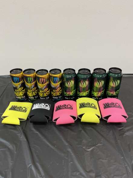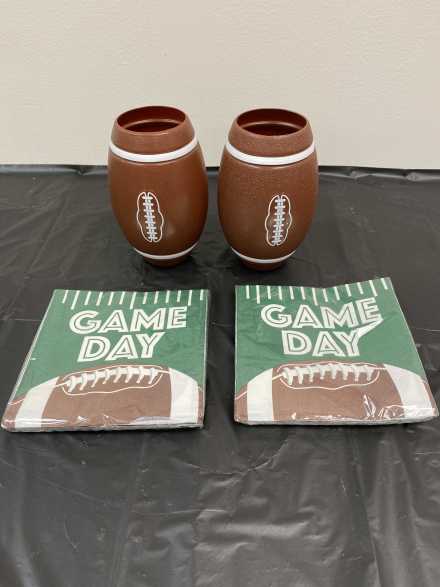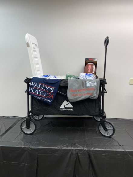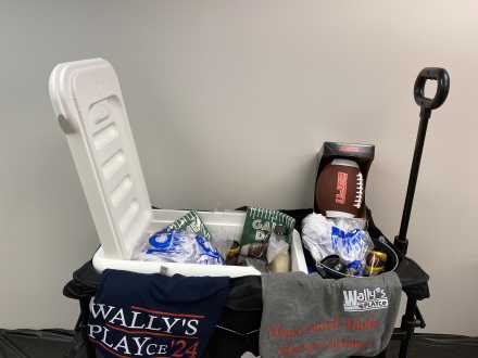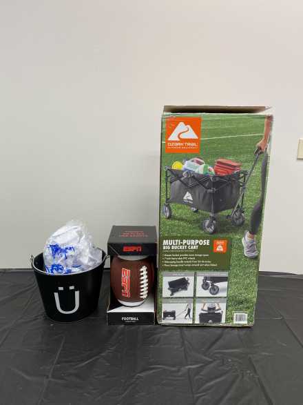 This black heavy duty Ozark Trail deep bucket wagon with handle is loaded up with all sorts of tailgating goodies! Includes 38-qt. Igloo cooler with tow bar, Jackson Morgan Southern Cream Salted Caramel Liqueur, Tia Maria Cold Brew Coffee Liqueur, two football-shaped drink cups, eight Monster Nasty Beast and The Beast hard liquor beverages, Wally's Playce size L gray long-sleeved shirt and size L navy t-shirt, five Wally's Playce liquor tokens, five Wally's Playce beer tokens and three koozies, two black metal buckets, ESPN junior size football, and "Game Day" napkins.