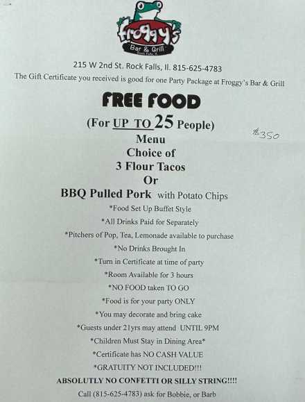 Treat 24 of your favorite people to a taco and BBQ pulled pork buffet party at Froggy's Bar & Grill. Includes choice of three flour tacos or pork with potato chips. Pitchers of pop, tea, lemonade available for purchase. All drinks paid for separately. No beverages brought in.
