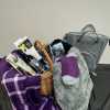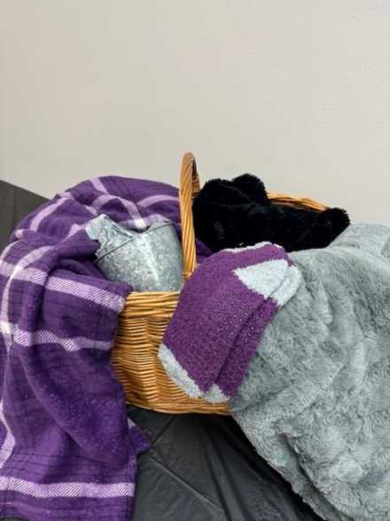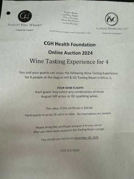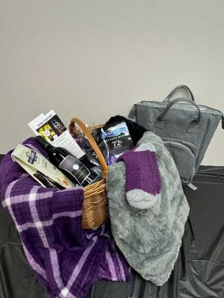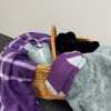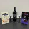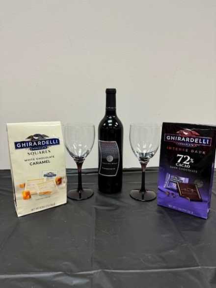 Enjoy a Wine Tasting with three of your friends at the August Hill Winery and Illinois Sparkling Co. Tasting Room in Utica, then relax at home with your bottle of August Hill Chambourcin Rose, two wine glasses, Ghiradelli white chocolate caramel squares and intense dark chocolate squares, black heated neck warmer, purple plaid throw and fuzzy socks, plush gray blanket, small metal bucket, and gray thermal tote bag, all in a large wicker basket.