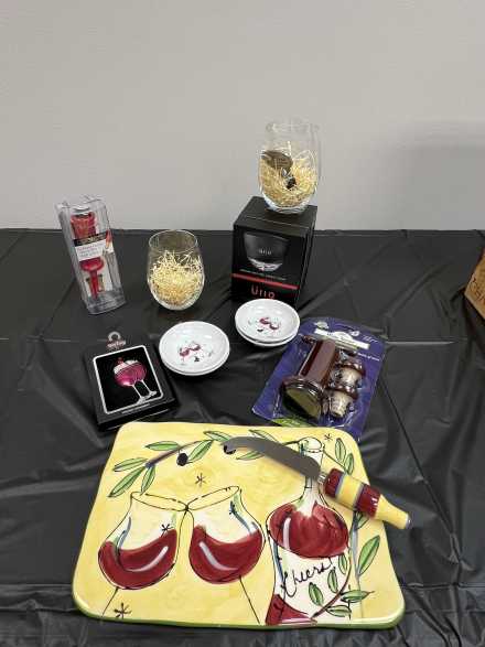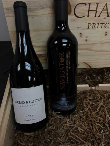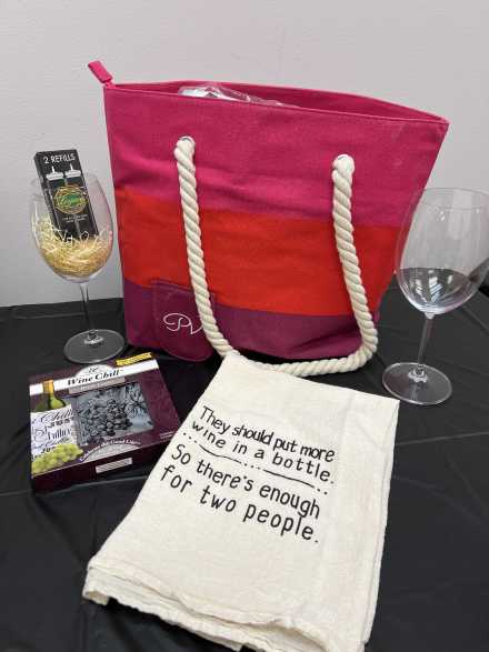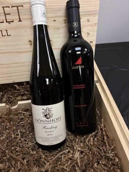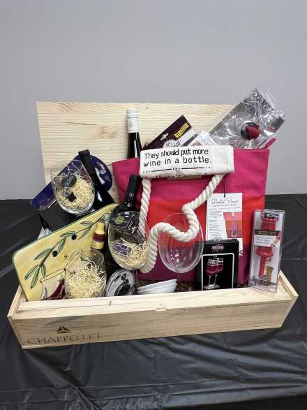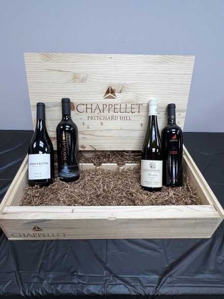 Here's a treasure trove of wine and whatever you need to create a great tasting experience, all contained in a wine box from Chappellett Pritchard Hill Winery in Napa Valley. Wines include 2017 Justin Cabernet Sauvignon, 2019 Donnhoff Riesling, 2020 Navigator Cabernet Sauvignon, and 2018 Bread and Butter Pinot Noir. Plus two wine glasses, two stemless wine glasses, Porto Vino Canvas Tote Wine Purse, Uiio wine purifier, Wine Savor Preservation System, 11-inch cheese platter/knife, Rabbit foil cutter, Wine Chill Bottle Cooler, two wine stoppers, Cork Pops wine opener, Cork Pops refills, Porto Vino wine pouch, "They should put more wine in a bottle so there's enough for two people" towel, wine glass holiday ornament, and four ceramic mini saucers for crackers.