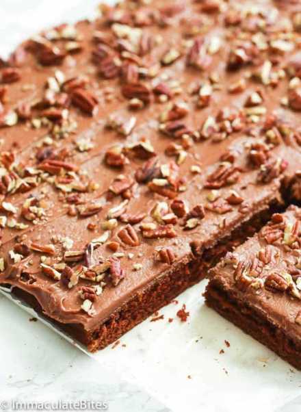 This rich, moist, chocolaty Texas sheet cake is topped with chocolate frosting and toasted pecans. Paired with ice cream, this tried and true single layer treat is one of Liz's specialties.