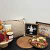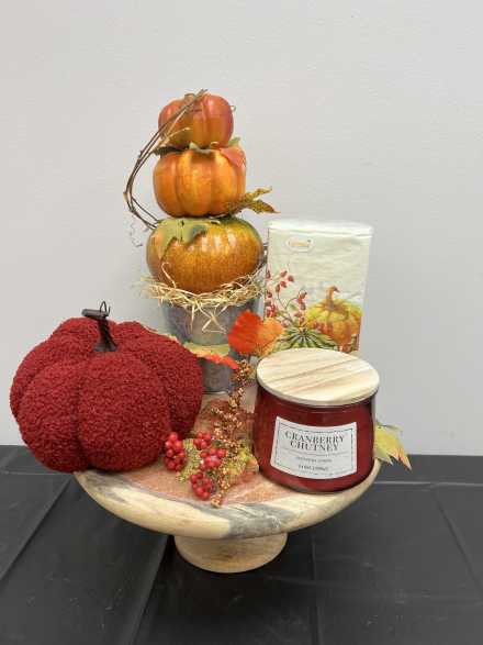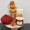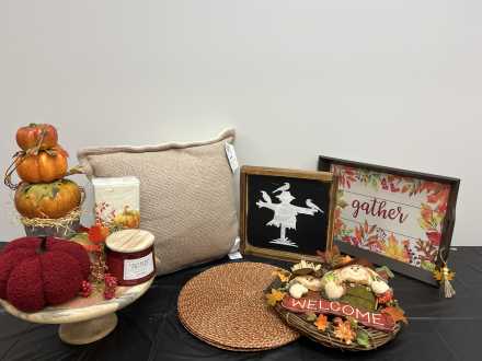 Set a festive fall table with serving tray, fall-themed napkins, six placemats, wooden serving pedestal, pumpkin stack centerpiece, burgundy stuffed pumpkin, cranberry chutney candle. Add the "Welcome" scarecrow wreath, wooden scarecrow wall hanging and 22 X 22 inch pillow to finish the look.