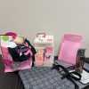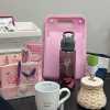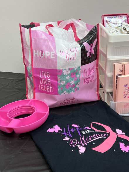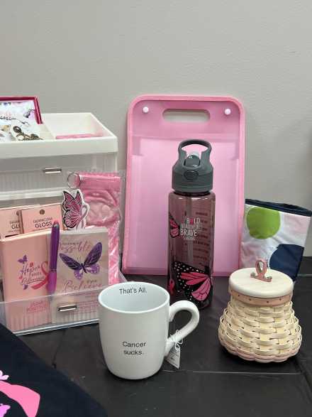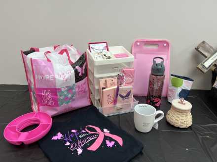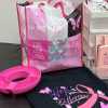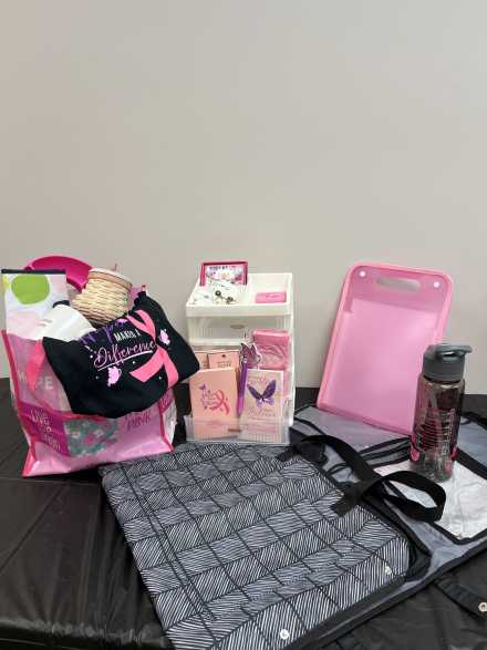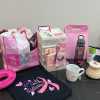 An uplifting collection of items for someone on a breast cancer journey. Includes pink Longaberger Hope basket with lid/liner, "Hope" bracelet, "Strong, Beautiful, Fierce" bracelet, "Bold, Beautiful, Brave, Strong" plastic water bottle, "Pretty in Pink" mirror, pink cosmetic organizer, two sets of Dashing Diva gel nail sets, size L black t-shirt, two pairs of earrings, Thirtyone insulated koozie with clip, "Cancer Sucks" mug, four-drawer plastic tower, Thirtyone black and white hangup bag, pink organizer, pink ribbon/butterfly key chain, pink socks, journal, and calendar, plus a carryall pink bag.