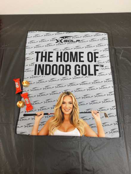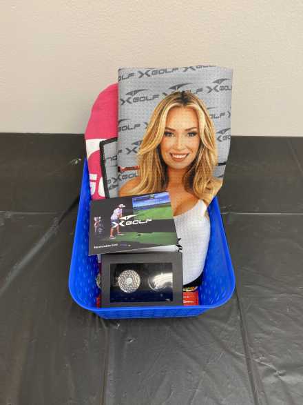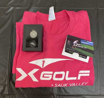 Make X-Golf Sauk Valley your indoor golf destination to play, train or entertain, featuring five state of the art golf simulators. Includes $50 gift card to X-Golf Sauk Valley, size L pink X-Golf sweatshirt, microfiber golf towel which reads "The Home of Indoor Golf", ball marker and hat pin, and Reese's and Kit Kat candies, contained in blue plastic tote.