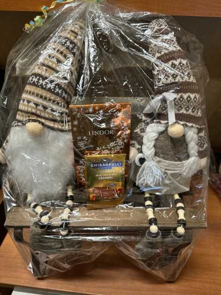 His and Her Gnomes, One Bench, Pumpkin Themed Throw Pillow and Lindt Lindor Snickerdoodle White Chocolate and Ghirardelli Carmel Squares