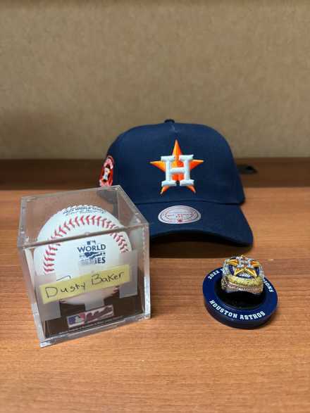 Dusty Baker (Manager of the Houston Astros) Signed Baseball, Replica 2022 World Champions Ring, Houston Astro Baseball Cap and Hat Clip.