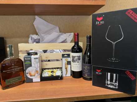Whiskey & Wine Gift Set - Distillers Select Woodford Reserve Kentucky Straight Rye Whiskey, The Calling 2021 Pinot Noir, Old Winery Road Cabernet, JB Ho Wine Glass & Whiskey Class, Corkscrew, Ice Mold and Wine Stoppers.