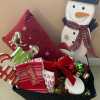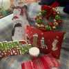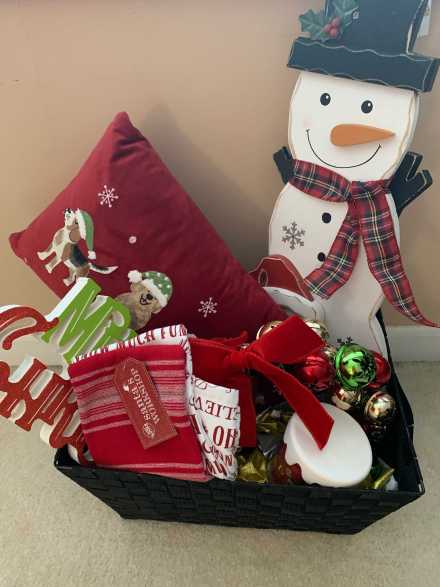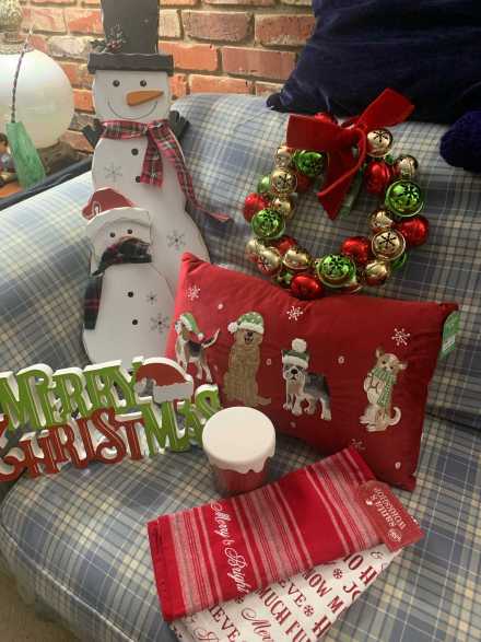 2 1/2' light up snowman porch leaner, 12" x 20" dog Christmas pillow, 2 pack Christmas kitchen towels, apple cinnamon scented candle, jingle bell decorative wreath, Merry Christmas tabletop decor.