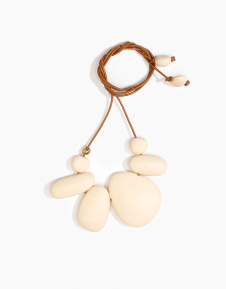 Smooth, stone-like resin beads are threaded onto a vegetable dyed leather cord for this rock-inspired style. The Riverstone Choker is finished with a nano-coated brass logo bead and additional resin beads at its tail ends, this style can be adjusted by securely knotting the cord to your ideal length