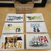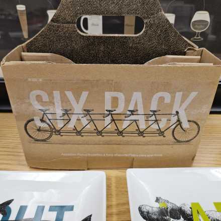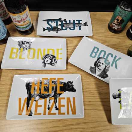 - Retired Crate & Barrel "Six Pack" of Appetizer Plates with funny illustrations representing different types of beer