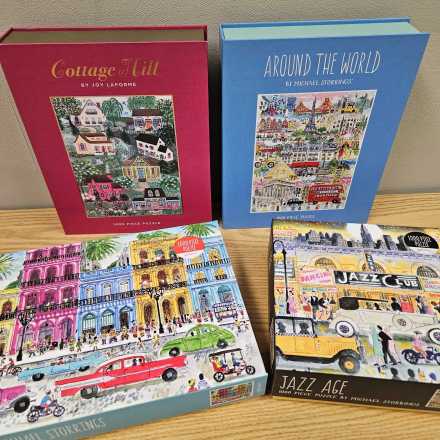 Included are 28 puzzles from name brands like Galison, Ravensburger, Re-marks, Master Pieces, White Mountain, and more! All are 1000 pieces and there are a variety of themes and artists.