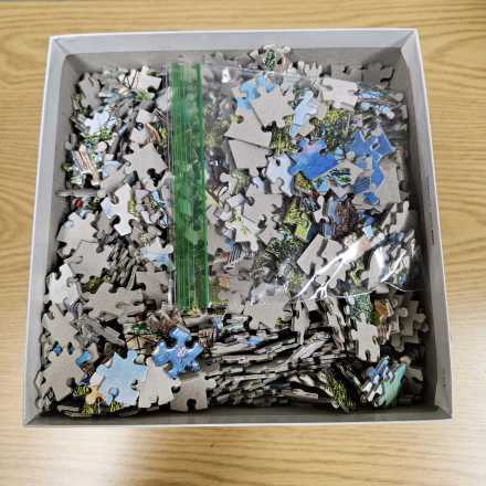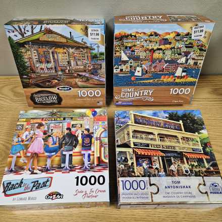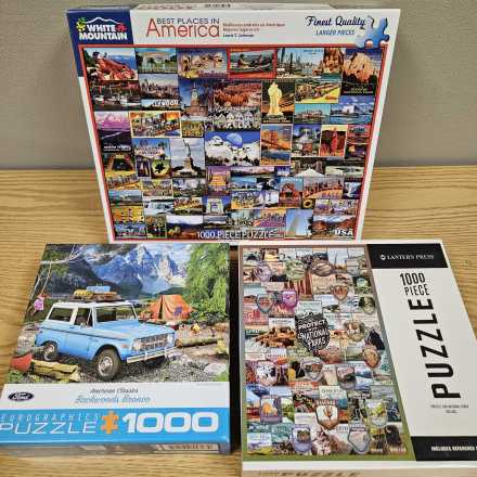 She purchased all of the puzzles new, put each together once, and returned the pieces to the box. Bonus: it looks like she kept the border pieces separated out for you! If you know, you know. From a pet-free, kid-free, smoke-free home.
