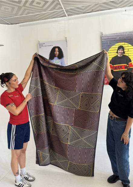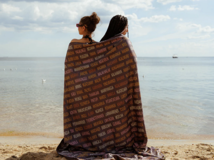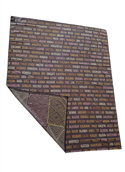 The Gathering Blanket is perfect for your little (or the biggest) Mob. This multifunctional blanket is your ultimate fam beach towel, picnic rug or cosy throw on a chilly night. The extra large Mob size means there is no need for everyone to bring their own towel because this blanket is a space to gather, after all sharing is caring! Engineered from premium LiteAs Microfibre fabric which is sand resistant, super-absorbent, compact and quick dry. This piece is designed with love ❤️ by Gunditjmara artist, Laura Thompson on Wurundjeri Country. Reversible blanket with two designs: one that is by inspired by traditional possum skin cloak and the values of Clothing The Gaps and the other which celebrates Aboriginal and Torres Strait Islander language groups as per the AIATSIS map.