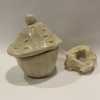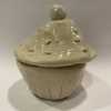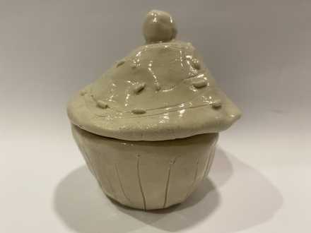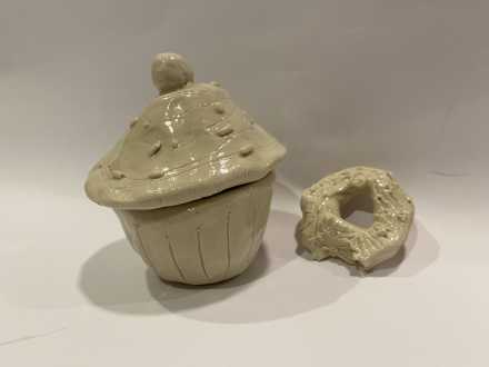 Stoneware ceramic sculptural trinket box and donut sculpture with clear gloss glaze. 7.5 x 8 cm cupcake; 1 x 4.5 cm donut.