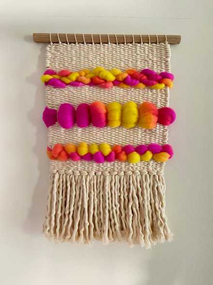 Recycled cotton cord, merino wool roving, and vintage wool yarn, 46 x 29 cm. A super bright woven wall hanging, sure to bring life to any wall!