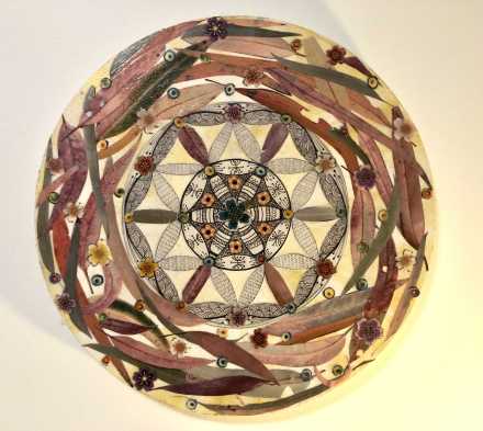 Mixed media (ink, fabric, leaves, varnish) on a circular canvas; 40 cm diameter. Veneta is an Education Support worker at BNWPS and talented weaver. She is responsible for the inspirational messages in crochet that have appeared from time to time at the school front gate on Culloden Street.