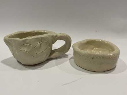Stoneware ceramic engraved jug and bowl with clear gloss glaze; jug: 3 x 8 x 4 cm; bowl: 2 x 5 cm.