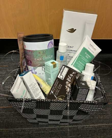 Assorted items including chocolates, skincare products, insulated can cooler and more.