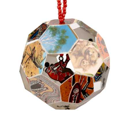 Tony’s bauble combines cut-out playing cards in hexagon shapes, accented with his recognisable “Aboriginalalia” imagery. A beaded thread holding an enamel wrecking-ball charm is visible through the open hexagons. His broader practice interrogates the systems that define and mediate Aboriginal art, reshaping these conversations into powerful statements of cultural strength and identity.