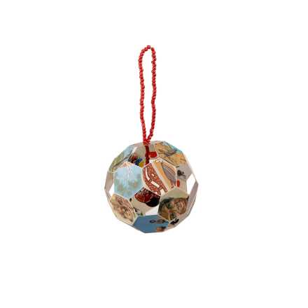 Tony’s bauble combines cut-out playing cards in hexagon shapes, accented with his recognisable “Aboriginalalia” imagery. A beaded thread holding an enamel wrecking-ball charm is visible through the open hexagons. His broader practice interrogates the systems that define and mediate Aboriginal art, reshaping these conversations into powerful statements of cultural strength and identity.