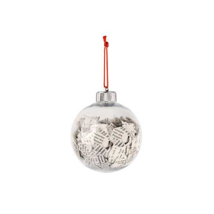 Jenna Lee, paper text fragments, plastic bauble, L 10cm, W 9cm, D 9cm.
