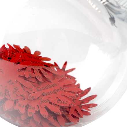 Jenna Lee, paper text fragments, plastic bauble, L 10cm, W 9cm, D 9cm.