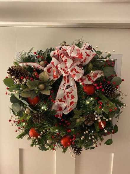 22" Christmas wreath with battery operated lights. Timer is 6 hours on and 18 hours off. Decorated with red and gold balls.