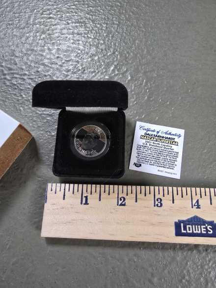This is a collectible 2001 "NASCAR Superstars" coin featuring a colorized image of Dale Earnhardt Sr. Includes box.