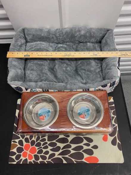 Dog/bowls combo with small pet bed measuring 16" x 15".  Elevated small dog feeder with 2 bowls.  Height of feeder is 3 1/2".  Food mat in fall tones.