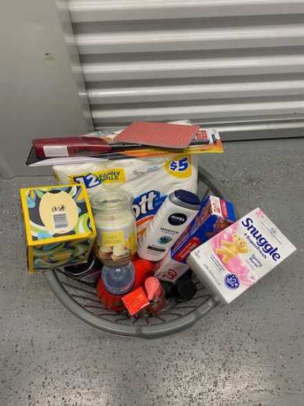 Round gray laundry basket filled with home supplies:  toilet paper, kleenex, Snuggle dryer sheets, pad of sticky notes, Nivea Men body wash, Axe mint and amber scent body spray, summer berry foaming hand soap, Colgate Optic White toothpaste, gallon size ziploc bags, Dawn Platinum dish soap, Tide ultra oxi laundry detergent, Lemon cupcake scented candle, multi-purpose lighter.