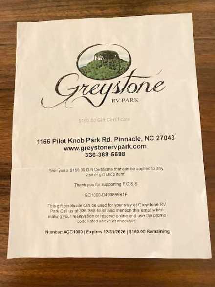 Gift certificate for your stay at Greystone RV Park in Pinnacle, NC.