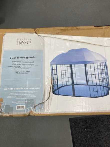 Oval Trellis Gazebo with powder-coated steel trellis framing, flat weave polyester fabric canopy, mosquito netting. Size: 12'6" L x 9'6" W x 9'7" H.