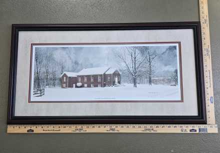 Limited edition print by North Carolina artist Frank Duncan, titled "Snowhill United Methodist Church". Created in 2004, this piece depicts the historic brick church in Peak, Durham County, NC, during a quiet snowfall. The soft light and delicate details capture the serenity of a snowy evening scene. Hand-signed by the artist in pencil and numbered 11/300. Professionally framed with double matting and displayed under glass. Perfect for collectors of Frank Duncan's regional works, admirers of historic churches, or anyone wishing to add a peaceful, faith-inspired winter scene to thir decor.