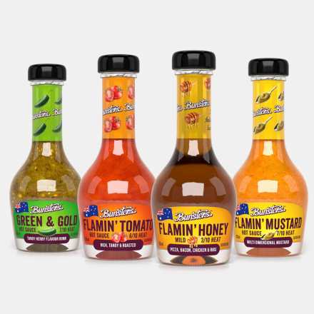 4 of Bunsters most flavorful sauces all in one handy pack. The heat on these isn't crazy but the flavours are off the chart. It's a box of deadset crowd pleasers. Buy this for any hot sauce fan and be prepared to receive a lot of love. Included are 4 x 150ml bottles.