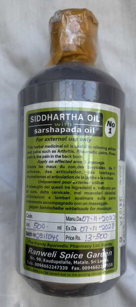 - Ranweli Spice Garden Siddhartha oil with sarshapada oil. Ex 7.11.22028. A time tested Ayurvedic oil for nerve and muscle pain. Especially beneficial for muscular pains in the chest, neck, and shoulders. Useful in relieving aches & pains such as arthritis, rheumatic pains, knee pain etc. 500ml
