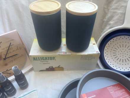 - 2 x General Eclectic storage jars with timber lids. 17 cm tall