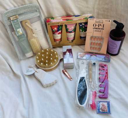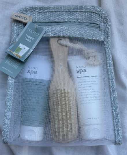 - Natio Spa Tropical Treats gift set with: foot revival cream, 100ml; soothing mint foot & hand scrub, 100ml; wooden pumice stone/ foot brush, cosmetic bag.