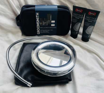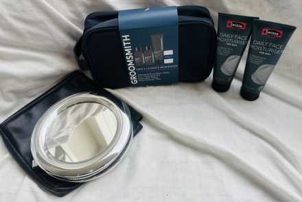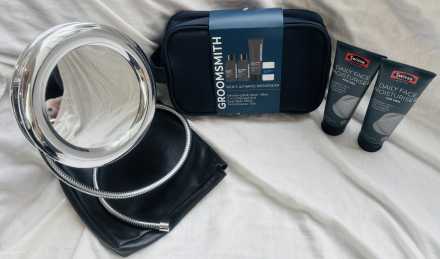 -Groomsmith toiletry bag with: Exfoliating body wash: 100ml; 2 in 1 shampoo body wash: 100ml; Facial cleanser:75ml; waffle towel