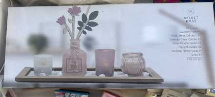 - Wicks & Wax Velvet Rose home gift set including: Wooden tray, 100ml reed diffuser, scented glass candle, glass candle holders x 2, tea light candles x 2, wooden flower decor, sand. Note: Box has an oil stain on it