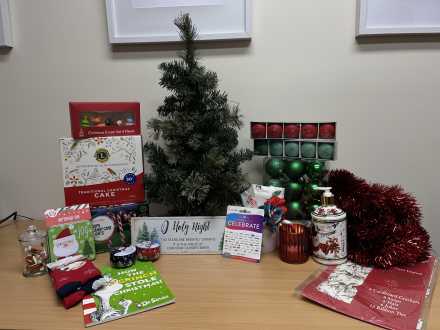 $50 Celebrate Gift Card, Free standing Christmas Tree, Floating Candles, Tea light holders, decorations, Lions Christmas Cake, Christmas Socks, Washi Tape and small gift tins, Shortbread, Christmas Hand soap, Bon bons, Candy Cane Lights, The Grinch that stole christmas book, Candy Cane earrings, Christmas Scrunchies, Christmas Teatowel,  Holy Night Wooden sign, Noel Christmas Mug,