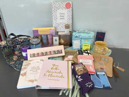 Colouring book, notepads, pens. diffuser, candles, nail polish, shower steamers, foot mask, socks, earrings, clutch bag, pedicure set, fluffy scarf, body sprays and a mug.
