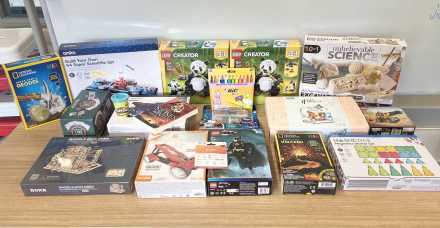 $50 Kids gift card, multiple science sets, national geographic sets, lego creators and sets, magnetics, world alive set, play dough, cards, textas and a novel.