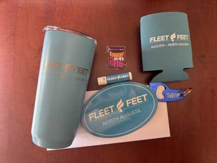 This package includes a $25 gift certificate from Fleet Feet Augusta, a Fleet Feet cup, koozie, bottle opener, magnet, chapstick and sticker.