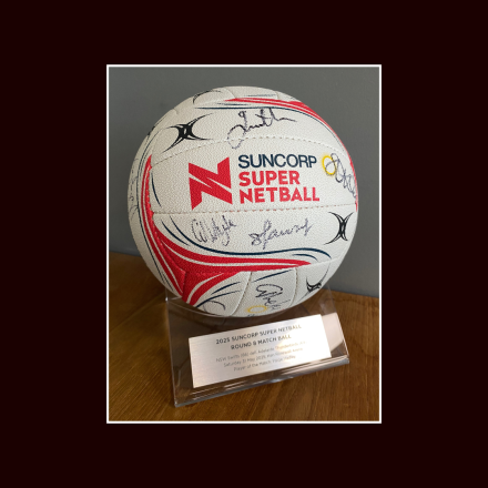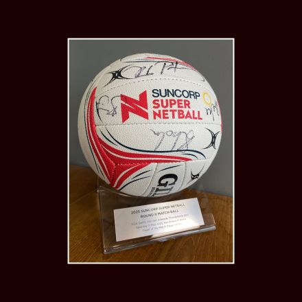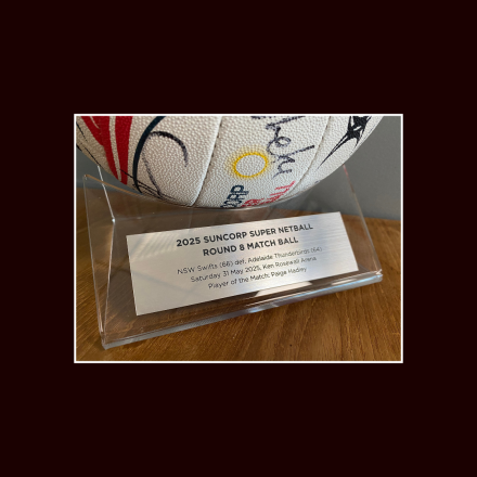 Signed 2025 Suncorp Super Netball Official Match Ball and Display Stand - RD 8 vs Thunderbirds
